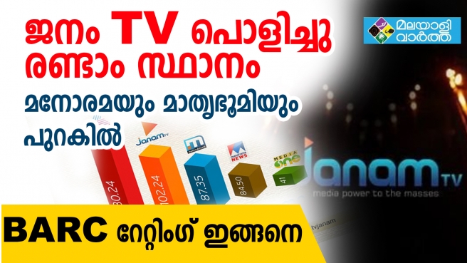 മലയാള ദൃശ്യമാധ്യമ ചരിത്രത്തിൽ അട്ടിമറി മുന്നേറ്റവുമായി ജനം ടി.വി.ഇന്ന് പുറത്തുവന്ന ടെലിവിഷന് റേറ്റിങ്ങുമായി ബന്ധപ്പെട്ട ബാര്ക്ക്(ബ്രോഡ്കാസ്റ്റ് ഓഡിയന്സ് റിസര്ച്ച് കൗണ്സില് ഇന്ത്യ)റിപ്പോര്ട്ട് അനുസരിച്ച് ഏഷ്യാനെറ്റ് ന്യൂസിന് പിന്നിലായി ജനം ടിവിയാണ് രണ്ടാം സ്ഥാനത്തെത്തിയത്. മനോരമ ന്യൂസ്, മാതൃഭൂമി ന്യൂസ് തുടങ്ങിയ വമ്പന്മാരെയാണ് ജനം ടിവി പിന്നിലാക്കിയത്.
