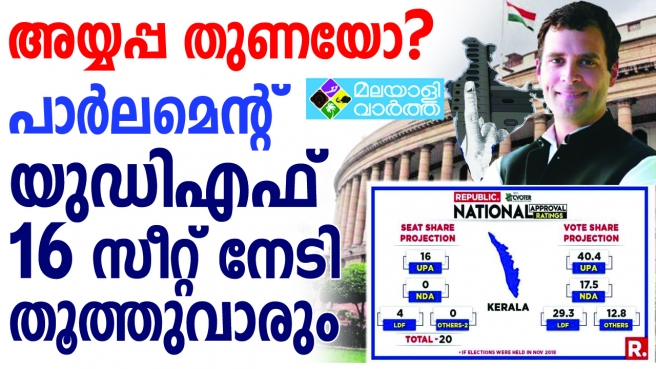 ലോക്സഭാ തെരഞ്ഞെടുപ്പില് ബിജെപിക്ക് കേരളത്തില് തിരിച്ചടി; ശബരിമല സ്ത്രീ പ്രവേശന വിഷയം ആളികത്തിച്ച് പ്രതിഷേധമുയര്ത്തിയാലും ബിജെപിക്ക് ലോക്സഭാ തെരഞ്ഞെടുപ്പില് അക്കൗണ്ട് തുറക്കാനാകില്ലെന്ന് റിപ്പബ്ലിക് ടിവിയുടെ സര്വ്വേ ഫലം