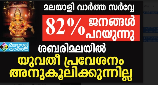 മലയാളി വാര്ത്ത സര്വ്വേയില് നിന്നു കൃത്യമായ കണ്ടെത്തലുകളാണ് ഞങ്ങള് പുറത്തുവിടുന്നത്. സര്വ്വേയില് പ്രതികരിച്ച 82.33% ശതമാനം ആളുകള് പറയുന്നു ശബരിലെയിലെ യുവതീ പ്രവേശനത്തെ തങ്ങള് അനുകൂലിക്കുന്നില്ല. കേരളത്തിലെ ഭൂരിപക്ഷ മനസ്സുകളുടെ വികാരമായി ഈ സര്വ്വേ ഫലത്തെ ഞങ്ങള് കാണുന്നു.
