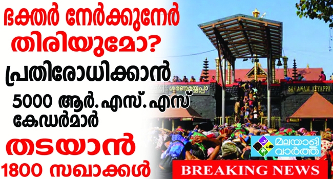 യുവതീ പ്രവേശനം തടയാൻ സംഘപരിവാറിന്റെ നേതൃത്വത്തിൽ സംസ്ഥാനത്തിനകത്തും പുറത്തും നിന്നുമായി 5000ൽ അധികം ആർ.എസ്.എസ് കേഡർമാരും സന്നിധാനത്ത് എത്തിയിട്ടുണ്ടെന്ന് അറിയുന്നു. യുവതികളെ തടയുന്ന സ്ത്രീകൾക്ക് സഹായവും സംരക്ഷണവും നൽകുകയാണ് ലക്ഷ്യം. ഇതിന് നേതൃത്വം നൽകുന്നത് കണ്ണൂരിലെ ആർ.എസ്.എസിന്റെ തീപ്പൊരി നേതാവ് വത്സൻ തില്ലങ്കരിയാണ്. കണ്ണൂരിലെ സി.പി.എം ആർ.എസ്.എസ് പ്രവർത്തകർ മുഖാമുഖം എത്തുന്നതോടെ ശബരിമല യുദ്ധസമാനമാകുമെന്ന് രഹസ്യാന്വേഷണ വിഭാഗവും റിപ്പോർട്ട് ചെയ്യുന്നു.
