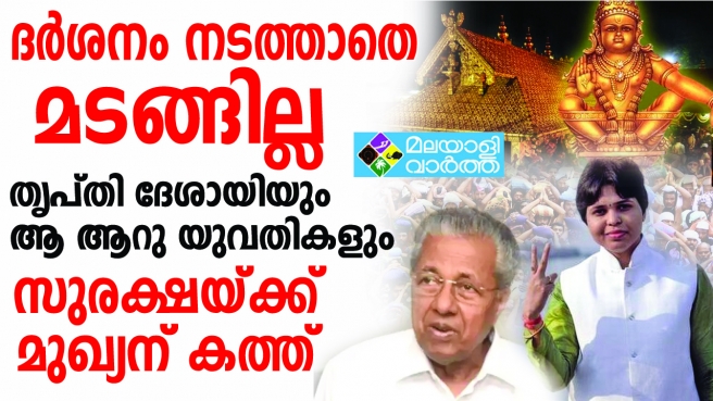 ആറ് സ്ത്രീകളുമായി തൃപ്തി ദേശായി വെള്ളിയാഴ്ച കേരളത്തില് എത്തും; ശബരിമല സന്ദര്ശനത്തിന് സുരക്ഷ വേണമെന്നാവശ്യപ്പെട്ട് മുഖ്യമന്ത്രിക്ക് കത്ത് നല്കി