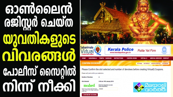 ഓൺലൈൻ രജിസ്റ്റർ ചെയ്ത യുവതികളുടെ വിവരങ്ങൾ പോലീസ് സൈറ്റിൽ നിന്ന് നീക്കി ; ശബരിമല ഡിജിറ്റല് ക്രൗഡ് മാനേജ്മെന്റ് സിസ്റ്റം, കെഎസ്ആര്ടിസി ഓണ്ലൈന് ടിക്കറ്റ് ബുക്കിങ് എന്നിവയിലൂടെ ദര്ശന സമയവും ബസ് ടിക്കറ്റും ബുക്ക് ചെയ്തവരാണിവര്