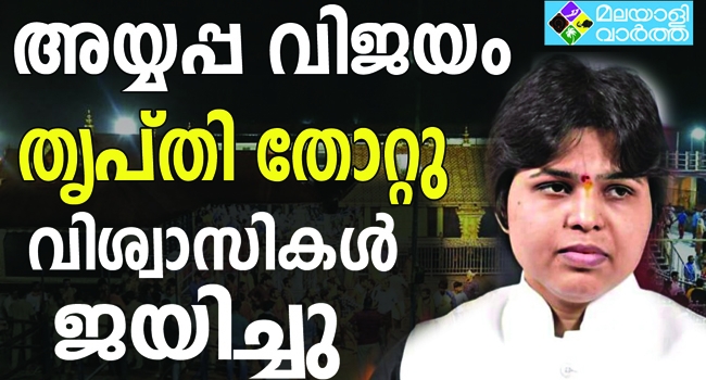 12 മണിക്കൂറിലേറെ എയർപോർട്ടിൽ കുടുങ്ങിയ തൃപ്തി ദേശായി ഒടുവിൽ തോൽവി സമ്മതിച്ചു. ഇതാണ് കേരളം ,ഇതാണ് വിശ്വാസികളുടെ ശക്തി.നിൽക്കക്കള്ളിയില്ലാതെ പോലീസ് വിരട്ടി. വിശ്വാസികൾ തീർത്ത പ്രതിരോധ കോട്ട ഭേദിക്കുവാൻ പോലീസും സർക്കാരും ഭയപ്പെട്ടു. ആക്ടിവിസത്തിന്റെ ഇന്ത്യയിലെ ഏറ്റവും വലിയ നേതാവ് നെടുമ്പാശേരിയിലിരുന്നു വിശ്വാസികളെ വെല്ലുവിളിച്ചപ്പോൾ കേരളം ഒന്നായി എതിർത്തു. ആ എതിർപ്പ് ഭരണകൂടത്തെ വിറപ്പിച്ചു.