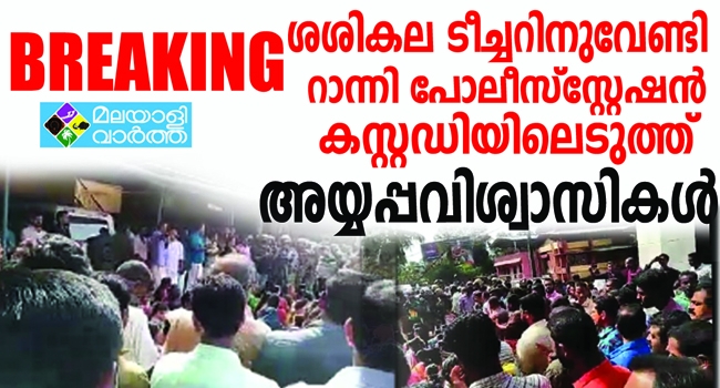 ഹിന്ദു ഐക്യവേദി നേതാവ് കെ.പി.ശശികലയെ അറസ്റ്റു ചെയ്തതിനെതിരെയുള്ള പ്രതിഷേധം ശക്തമാകുന്നു. അയ്യപ്പ വിശ്വാസികൾ റാന്നി പോലീസ് സ്റ്റേഷൻ പൂർണമായും വളഞ്ഞിരിക്കയാണ്. കൂടുത ഭക്തർ അവിടേക്ക് എത്തിക്കൊണ്ടിരിക്കുന്നു. അന്യായമായി അറസ്റ്റു ചെയ്ത പൊലീസുദ്യോഗസ്ഥർക്കെതിരെ നടപടി എടുക്കണമെന്നാണ് സമരക്കാരുടെ ആവശ്യം .