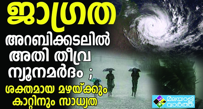 അറബിക്കടലില് വരും മണിക്കൂറില് അതി തീവ്ര ന്യൂനമര്ദം ശക്തിപ്പെടുമെന്നു കാലാവസ്ഥാ വകുപ്പ് മുന്നറിയിപ്പ് നൽകി. കനത്ത മഴയ്ക്കും കാറ്റിനും സാധ്യത