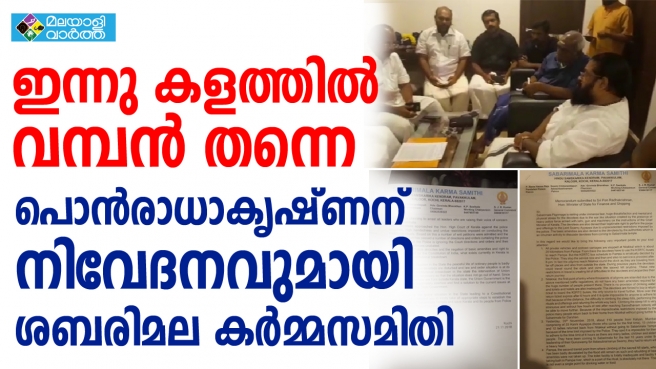 ശബരിമല കർമ്മ സമിതി നേതാക്കൾ കേന്ദ്രമന്ത്രി പൊൻ രാധാകൃഷ്ണന് നിവേദനം നൽകി. കേരളാ മുഖ്യ മന്ത്രിയുടെ നിര്ദേശപ്രകാരം ലാത്തിയും ഗണ്ണും മറ്റു ആയുധങ്ങളുമായി വന്തോതിലുള്ള പോലീസ് സാന്നിധ്യം ശബരിമലയില്യുദ്ധ സമാനമായ സാഹചര്യം ഉണ്ടാക്കിയിട്ടുള്ളതിനാല് ശബരിമല തീര്ത്ഥാടനം ഭക്തര്ക്ക് ഭീതിയ്ക്കും, അസംതൃപ്തിയ്ക്കും വലിയ ശാരീരിക മാനസിക ബുദ്ധിമുട്ടുകള്ക്കും വഴിവയ്ക്കുകയാണ് എന്ന് നിവേദനത്തിൽ പറയുന്നു.