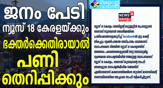 പോസ്റ്റ് വന്നതോടെ സനോജിനെതിരെ സോഷ്യല് മീഡിയയില് മുറവിളികളായി. അയ്യപ്പഭക്തരെ മുറിവേല്പ്പിക്കുന്ന നിലപാട് എടുത്താല് ഇപ്പോള് തന്നെ റേറ്റിംഗില് പിന്നില് നില്ക്കുന്ന തങ്ങള്ക്ക് അത് വന് തിരിച്ചടിയാകുമെന്ന് മാനേജ്മെന്റും എഡിറ്റോറിയലും തിരിച്ചറിഞ്ഞു. ഇതോടെ വിശദീകരണവുമായി ന്യൂസ് 18 മാനേജ്മെന്റ് രംഗത്തെത്തി. 'ന്യൂസ് 18 കേരളം അസിസ്റ്റന്റ് ബുള്ളറ്റിന് പ്രൊഡ്യൂസര് സനോജ് സുരേന്ദ്രന് ശബരിമലയിലെ പ്രതിഷേധങ്ങളെ കുറിച്ച് ഫേസ്ബുക്കില് ഇട്ട കമന്റ് തികച്ചും വ്യക്തിപരമായ അഭിപ്രായം മാത്രമാണ്. സ്ഥാപനമെന്ന നിലയില് ന്യൂസ് 18 കേരളത്തിന് അത്തരം പരാമര്ശങ്ങളുമായി ഒരുബന്ധവുമില്ല. വ്യക്തമായ സോഷ്യല് മീഡിയ നയമുള്ള സ്ഥാപനമാണ് ന്യൂസ് 18. സനോജ് സുരേന്ദ്രന്റെ നടപടി ഞങ്ങളുടെ സോഷ്യല് മീഡിയ നയത്തിന് എതിരാണെന്ന് കണ്ടെത്തിയതിനെ തുടര്ന്ന് മാനേജ്മെന്റ് അച്ചടക്ക നടപടി സ്വീകരിച്ചിട്ടുണ്ട്'.