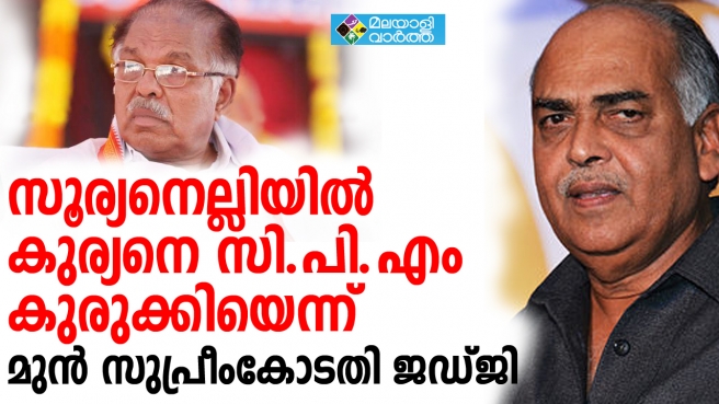 സൂര്യനെല്ലിക്കേസില് കോണ്ഗ്രസ് നേതാവ് പി.ജെ കുര്യനെ സി.പി.എം കുടുക്കുകയായിരുന്നെന്നും പാര്ട്ടി അനുഭാവിയായ സീനിയര് അഭിഭാഷകന് ജനാര്ദ്ദനക്കുറുപ്പിന് ഇതില് പങ്കുണ്ടെന്നും മുന് സുപ്രീംകോടതി ജഡ്ജി ആയിരുന്ന സിറിയക് ജോസഫ്. സഫാരി ചാനലിലൂടെയാണ് അദ്ദേഹം ഈ വെളിപ്പെടുത്തല് നടത്തിയത്. തന്റെ വെളിപ്പെടുത്തലിന് ഉപോദ്ബലകമായ ന്യായവാദങ്ങളും വിവരങ്ങളും അദ്ദേഹം വ്യക്തമാക്കുന്നുണ്ട്. അദ്ദേഹത്തിന്റെ വെളിപ്പെടുത്തലിന്റെ പ്രധാന പോയിന്റുകളിങ്ങനെയാണ്: