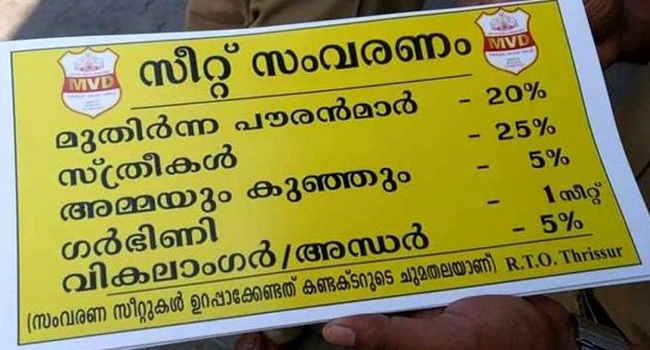 ഈ സംവരണസീറ്റുകള് അര്ഹതപ്പെട്ടവര്ക്ക് ഉറപ്പാക്കേണ്ട ഉത്തരവാദിത്വം കണ്ടക്ടര്ക്കാണെന്ന് മോട്ടോര് വാഹന വകുപ്പ് വ്യക്തമാക്കുന്നു.