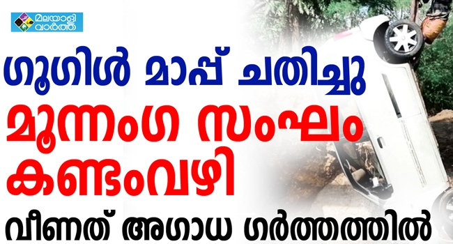 ഗൂഗിള് മാപ്പ് നോക്കി പോയ മൂന്നംഗ സംഘത്തിന്റെ കാര് പാലം പണിയ്ക്കായി കുഴിച്ച 30 അടി താഴ്ചയുള്ള വെള്ളക്കെട്ടില് തലകീഴായി മറിഞ്ഞു. പാലമറ്റം-ആവോലിച്ചാൽ റോഡ് വഴി മൂന്നാറിനു പോകുകയായിരുന്നു ഈ മൂന്നംഗ സംഘം. പാലമറ്റത്തിനു സമീപം ഇഞ്ചത്തൊട്ടി ഒന്നാം ബ്ലോക്കിനു സമീപത്തു വച്ചാണ് പാലം പണിക്ക് കുഴിച്ച 30 അടി താഴ്ചയിലേക്ക് കാർ തലകീഴായി മറിഞ്ഞത്. യാത്രികര് അത്ഭുതകരമായി നിസാര പരിക്കുകളോടെ രക്ഷപ്പെട്ടു.