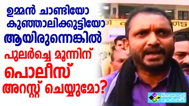 ഉമ്മൻ ചാണ്ടിയോ, കുഞ്ഞാലിക്കുട്ടിയോ ആയിരുന്നെങ്കില് പുലർച്ചെ മൂന്നിന് പൊലീസ് അറസ്റ്റ് ചെയ്യുമോ എന്ന് ബി ജെ പി സംസ്ഥാന ജനറൽ സെക്രട്ടറി കെ സുരേന്ദ്രൻ. ശബരിമലയില് യുവതീ പ്രവേശനത്തിന് വേണ്ടിയാണോ വനിതാ മതിൽ എന്ന് മുഖ്യമന്ത്രി വ്യക്തമാക്കണമെന്നും, ശബരിമലയിലെ യുവതീ പ്രവേശനത്തില് സർക്കാർ പരാജയപ്പെട്ടു എന്നും തിരുവനന്തപുരത്ത് നടന്ന വാര്ത്താസമ്മേളനത്തില് കെ സുരേന്ദ്രന് പറഞ്ഞു.