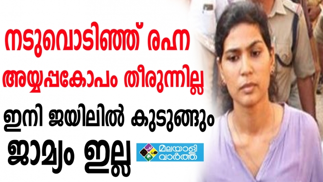കെ സുരേന്ദ്രനടക്കം ശബരിമല വിവാദത്തിൽ പെട്ട എല്ലാ ഹിന്ദു നേതാക്കളും ഇപ്പോൾ ജയിൽ വിമുക്തരായി.രഹ്ന മാത്രമാണ് ഇപ്പോഴും കസ്റ്റഡിയിൽ കഴിയുന്നത്. രഹ്നയുടെ സ്ഥിതിയാണെങ്കിൽ തീരെ പരിതാപകരമാണ് താനും. അറസ്റ്റ് ചെയ്യുന്ന വേളയിലും പിന്നീടും അസാധാരണമായ ധൈര്യം കാണിച്ച രഹ്ന ജഡ്ജിക്ക് മുമ്പിലെത്തിയപ്പോള് പൊട്ടിക്കരഞ്ഞു. തനിക്ക് അബദ്ധം പറ്റിയതാണെന്നും ഇനി ആവര്ത്തിക്കില്ലെന്നും പറഞ്ഞാണ് രഹ്ന പൊട്ടിക്കരഞ്ഞത് . ഏതായാലും അയ്യപ്പ കോപം തീർന്നോ എന്നറിയാൻ ഇനി ഈ മാസം പതിനാലു വരെ കാത്തിരിക്കണം