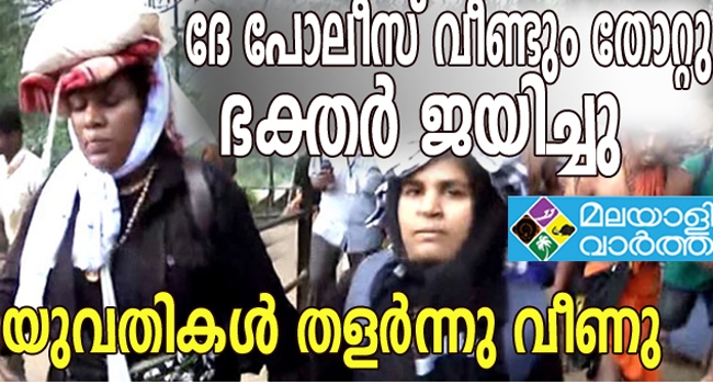 വളരെ ആവേശപൂര്വം മലകയറിയ യുവതികള് അവസാനം തളര്ന്നുപോയി. വന് പ്രതിഷേധം വന്നതോടെ പോലീസുകാരും പിന്തിരിഞ്ഞു. ഇതിനിടെ ഒരു യുവതി തളര്ന്നു വീഴുകയും ചെയ്തു. സര്ക്കാരും യുവതികളെ താഴെയിറക്കാന് നിര്ദേശം നല്കി. അവസാനം ക്രമസമാധാന പ്രശ്നം പറഞ്ഞ് പോലീസുകാര് തന്നെ അവരെ മലയിറക്കി.