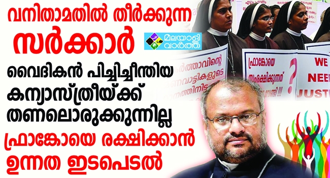 വീണ്ടും പ്രക്ഷോഭത്തിനൊരുങ്ങി കന്യാസ്ത്രീകൾ; ബലാത്സംഗകേസില് ബിഷപ്പ് ഫ്രാങ്കോ മുളയ്ക്കലിനെതിരായ സ്പെഷ്യൽ പ്രോസിക്യൂട്ടറെ ഇനിയും നിയമിച്ചില്ല; ഫ്രാങ്കോയെ രക്ഷിക്കാൻ ഉന്നത ഇടപെടൽ എന്ന് ആരോപണം