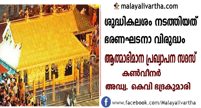 സ്ത്രീപ്രവേശനത്തിന് പിന്നാല ശബരിമല നട അടച്ചു ശുദ്ധികലശം നടത്തിയത് സ്ത്രീത്വത്തെ അപമാനിക്കുന്നതിനു തുല്യമെന്ന് സ്ത്രീകളുടെ ആത്മാഭിമാന പ്രഖ്യാപന സദസ് . ഭരണഘടനാ വിരുദ്ധമായ അയിത്താചരണത്തിന് എതിരെ ശക്തമായ നിയമ നടപടിയെടുക്കണമെന്ന് ആവശ്യപ്പെട്ടാണ് കണ്വീനര് അഡ്വ. കെവി ഭദ്രകുമാരി രംഗത്തു വന്നിരിക്കുന്നത്