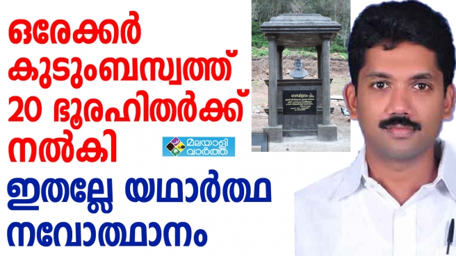ഒരു തുണ്ട് ഭുമിയ്ക്കൂ വേണ്ടി കൊല്ലും കൊലപാതകവും നടക്കുന്ന കേരളത്തില് ഒരു ചെറുപ്പക്കാരന് തനിക്ക് കുടുംബ സ്വത്തായി കിട്ടിയ ഒരേക്കര് പത്ത് സെന്റ് സ്ഥലം നിര്ദ്ധനരും ഭുരഹിതരുമായ 20 പേര്ക്കായി വീതിച്ചു നല്കി