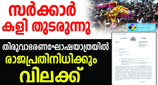 ഇത്തവണ തിരുവാഭരണ ഘോഷയാത്രയെ അനുഗമിക്കാൻ പന്തളം രാജപ്രതിനിധിക്കു പോലും ആകാത്ത വിചിത്രമായ അവസ്ഥ. മകരവിളക്ക് ദിവസം അയ്യപ്പവിഗ്രഹത്തില് ചാര്ത്താനുള്ള തിരുവാഭരണം വഹിച്ചുള്ള ഘോഷയാത്ര പന്തളം വലിയകോയിക്കല് ശ്രീ ധര്മ്മശാസ്താ ക്ഷേത്രത്തില് നിന്ന് ആണ് പുറപ്പെടുന്നത് . തിരുവാഭരണ വാഹക സംഘവും കൊട്ടാരം അധികൃതരും ചേര്ന്ന് തിരുവാഭരണം ശിരസിലേറ്റാതെ വലിയ കോയിക്കല് അയ്യപ്പ ക്ഷേത്രത്തിലെത്തിക്കും. പൂജിച്ച ഉടവാള് പിന്നീട് മേല്ശാന്തി പന്തളം രാജാവിനും രാജാവ് കൊട്ടാരം പ്രതിനിധിക്കും കൈമാറും. തുടര്ന്ന് തിരുവാഭരണം പേടകത്തിലാക്കി ശിരസിലേറ്റി ഘോഷയാത്രയായി ശബരിമലയിലെത്തി അയ്യപ്പന് ചാർത്തും . ഇതാണ് പതിവും ആചാരവും.
