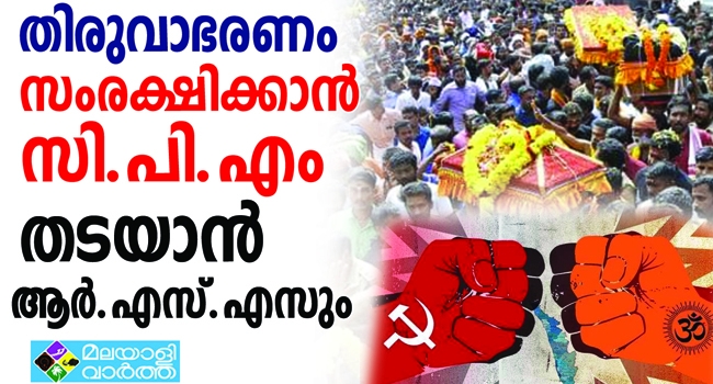 തിരുവാഭരണ ഘോഷയാത്രയിൽ സി പി എം വിശ്വസ്തരെ കൂടി പങ്കെടുപ്പിക്കാനാണ് സർക്കാർ ലക്ഷ്യമിടുന്നത്. ഘോഷമാത്രയിൽ ആർ എസ് എസുകാർ കടന്നുകൂടാതിരിക്കാനുള്ള എല്ലാ പ്രതിരോധ പ്രവർത്തനങ്ങളും സർക്കാരും സി പി എമ്മും നടത്തുന്നുണ്ട്. ഘോഷയാത്ര തടസപ്പെടുത്താൻ പരിവാർ സംഘടനകൾ ശ്രമിക്കുമെന്ന വിവരത്തിന്റെ അടിസ്ഥാനത്തിൽ അത്തരക്കാരെ നേരിടാനും സർക്കാർ ശ്രമം തുടങ്ങി കഴിഞ്ഞു.