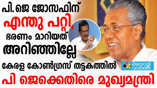 പി.ജെ.ജോസഫ് ഇപ്പോൾ മന്ത്രിയല്ല. എംഎൽഎ ആണ്. കേരളത്തിൽ ഇപ്പോൾ എൽഡിഎഫ് ആണു ഭരിക്കുന്നത്. ഭരണം മാറിയത് ജോസഫ് അറിഞ്ഞില്ലേ? എംഎൽഎയുടെ സുഹൃത്തുക്കൾ ആരെങ്കിലുമുണ്ടെങ്കിൽ അദ്ദേഹത്തോട് ഇക്കാര്യം പറയണം. ജോസഫിന് എന്തു പറ്റി? ദീർഘകാലം എംഎൽഎയും മന്ത്രിയുമായി പ്രവർത്തിച്ച ജോസഫ് ഇത്തരം കാര്യങ്ങളിൽ അജ്ഞത നടിക്കുകയാണ്. ഒന്നിലേറെ മന്ത്രിമാർ പങ്കെടുക്കുന്ന പരിപാടികളിൽ ഒരു മന്ത്രി അധ്യക്ഷനാകും. ഇതാണു പതിവ് ചട്ടം. നാടിന്റെ പുരോഗതിക്ക് ഭരണ– പ്രതിപക്ഷം ഒരുമിച്ചു നിൽക്കേണ്ട നേരത്ത് ഇത്തരം നിലപാടുകൾ ശരിയല്ല’– മുഖ്യമന്ത്രി പറഞ്ഞു. കിട്ടിയ അവസരത്തിൽ നല്ല നാലു കൊട്ട് കൊടുത്തിട്ടാണ് മുഖ്യന്റെ മടക്കം. പണ്ട് മാണിയെ വീഴ്ത്തി യു ഡി എഫ് പൊളിക്കാൻ നോക്കിയ എൽ ഡി എഫിന്റെം മാണിയുടെയും പദ്ധതി പൊളിച്ചതും പി ജെ. പിണറായിക്ക് ഒരു കലിപ്പ് ഇല്ലാതിരിക്കുമോ?