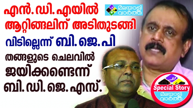സീറ്റ് വിഭജനം ആരംഭിക്കുന്നതിന് മുമ്പുതന്നെ ആറ്റങ്ങലിനെചൊല്ലി എന്.ഡി.എയില് കൂട്ടയടി. ആറ്റിങ്ങല് വിടില്ലെന്ന് ബി.ജെ.പി. കിട്ടിയേതീരൂവെന്ന് ബി.ഡി.ജെ.എസ്. എന്.ഡി.എയില് തര്ക്കം കൊഴുക്കുമ്പോഴും ഈ സീറ്റിന് കണ്ണുംനട്ട് നേതാക്കളും രംഗത്ത്
