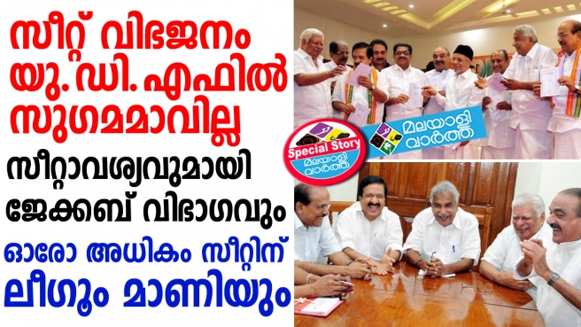 ഇന്ന് യു.ഡി.എഫ് യോഗം ചേരുന്നതുതന്നെ സീറ്റ് വിഭജനത്തില് ഒരു അന്തിമരൂപം ഉണ്ടാക്കാനാണ്. ലീഗിന് പതിവുപോലെ രണ്ടു സീറ്റ്, മാണിവിഭാഗത്തിനും ആര്.എസ്.പിക്കും ഓരോ സീറ്റ് ബാക്കി 16 കോണ്ഗ്രസ് എന്നായിരുന്നു കണക്കുകൂട്ടല്. എന്നാല് ഒരു സീറ്റ് കൂടുതല് വേണമെന്ന ആവശ്യം ലീഗിന്റെ ഭാഗത്തുനിന്നുമുണ്ട്. ഇതിന് പുറമെ ഇടുക്കി വേണമെന്ന പഴയ ആവശ്യം മാണി ഗ്രൂപ്പിനുമുണ്ട്. അതിന് പുറമെയാണ് ജേക്കബ് വിഭാഗത്തിന്റെ സീറ്റ് ആവശ്യവും. ഇത് മുന്നണിയുടെ സീറ്റ് വിഭജനം അത്ര സുഗമായി അവസാനിക്കുന്നതിന് തടസമാകും. ഉഭയകക്ഷികള് ചര്ച്ചകളും മറ്റും നടത്തിയാല് മാത്രമേ രമ്യമായി പ്രശ്നപരിഹാരം സാദ്ധ്യമാകുകയുള്ളു. ഇന്ന് ചര്ച്ചകള് തുടങ്ങിവച്ച് ഈ മാസം അവസാനത്തിനുള്ളില് തന്നെ പൂര്ത്തിയാക്കാനായിരിക്കും നീക്കം. ആവശ്യങ്ങള് പലതുണ്ടെങ്കിലും ഇതൊന്നും പരിഗണിക്കാനാവില്ലെന്ന നിലപാടിലാണ് കോണ്ഗ്രസും.