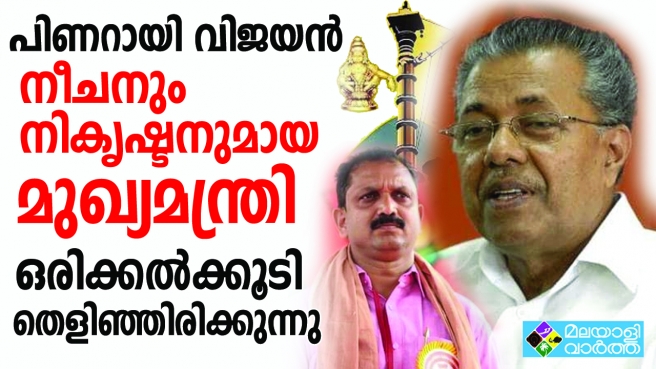 പിണറായി വിജയൻ നീചനും നികൃഷ്ടനുമായ മുഖ്യമന്ത്രിയെന്ന് ബിജെപി സംസ്ഥാന ജനറല് സെക്രട്ടറി കെ സുരേന്ദ്രൻ. സുപ്രീംകോടതി വിധിയുടെ അടിസ്ഥാനത്തിൽ ശബരിമലയിൽ ഇതുവരെ 51 യുവതികൾ മല കയറിയെന്ന് സംസ്ഥാനസർക്കാർ സുപ്രീംകോടതിയെ അറിയിച്ചു. എന്നാൽ ശബരിമല സുപ്രീംകോടതി റിവ്യൂ പെറ്റീഷൻ അട്ടിമറിക്കാനും ശബരിമലയെ തകർക്കാനുമുള്ള കള്ള റിപ്പോർട്ടാണിത് എന്ന് അദ്ദേഹം പ്രതികരിച്ചു. ഫേസ്ബുക്പോസ്റ്റിലൂടെയായിരുന്നു സുരേന്ദ്രന്റെ പ്രതികരണം.