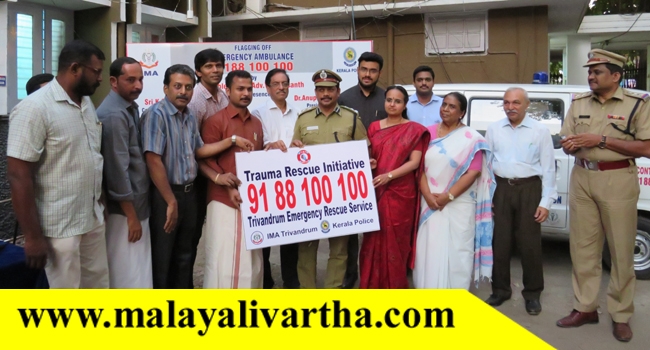 തിരുവനന്തപുരം: 9188 100 100 എന്ന അടിയന്തര ആംബുലന്സ് സേവനത്തിനുള്ള ഐ.എം.എ.യുടെയും കേരള പോലീസിന്റെയും സംരംഭമായ ട്രോമ റെസ്ക്യൂ ഇനിഷിയേറ്റീവ് (TRI) കൂടുതല് കാര്യക്ഷമമാകുന്നു. ഇതിന്റെ ഭാഗമായി തിരുവനന്തപുരം നഗരത്തിലെ അടിയന്തര രക്ഷയ്ക്കായി ഐ.എം.എ കണ്ടോള്മെന്റ് പോലീസ് സ്റ്റേഷനു സമീപം ഒരു ആംബംലന്സ് കൂടി 24 മണിക്കൂര് സേവനത്തിന്നായി വ്യന്യസിച്ചു. ഇതിന്റെ പ്രവര്ത്തനോത്ഘാടനം മേയര് അഡ്വ. വി.കെ. പ്രശാന്തും സിറ്റി പോലീസ് കമ്മീഷണര് കെ. സുരേന്ദ്രനും ചേര്ന്ന് നിര്വഹിച്ചു. ഇതോടൊപ്പം പോലീസ് സേനാംഗങ്ങള്ക്കും സന്നദ്ധ പ്രവര്ത്തകര്ക്കും അടിയന്തര രക്ഷയെ കുറിച്ചുള്ള പരിശീലനവും നല്കി.