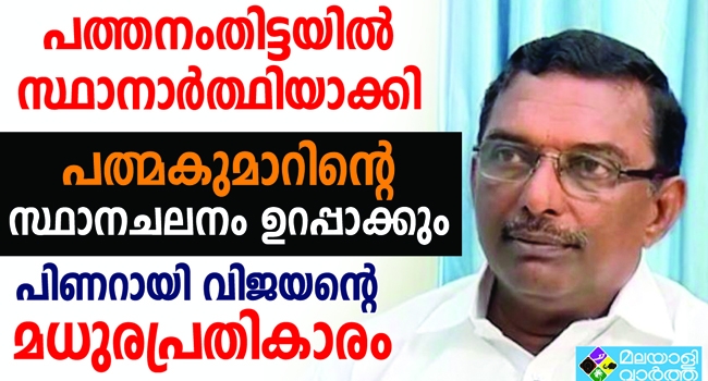 ഇതിന്റെ ഭാഗമായി പത്തനംതിട്ട കേന്ദ്രീകരിച്ച് പ്രവര്ത്തിക്കാന് പത്മകുമാറിന് പാര്ട്ടി നിര്ദേശം നല്കി. പത്മകുമാറിനെ മാറ്റിയേ അടങ്ങൂവെന്ന വാശിയിലാണ് മുഖ്യമന്ത്രി. ശബരിമല വിഷയം സര്ക്കാരിന് ഇത്രയധികം ദേഷമായി ഭവിച്ചത് പത്മകുമാറിന്റെ അഴകൊഴമ്പന് നയമാണെന്നാണ് മുഖ്യമന്ത്രിയുടെ നിലപാട്. പാര്ട്ടിക്കൊപ്പം നിന്ന് ഉറച്ച നിലപാട് എടുക്കേണ്ടതിനു പകരം പത്മകുമാര് സര്ക്കാരിനെ പലവട്ടം സമ്മര്ദത്തിലാക്കി. ഏറ്റവും ഒടുവില് സര്ക്കാര് സുപ്രീംകോടതിയില് സമര്പ്പിച്ച ശബരിമല കയറിയ 51 യുവതികളുടെ ലിസ്റ്റിലും പാര്ട്ടിയേയും സര്ക്കാരിനേയും തള്ളുന്ന നിലപാടായിരുന്നു പത്മകുമാര് സ്വീകരിച്ചത്. പത്മകുമാറിനെ ഇതോടെ മാറ്റിയേ തീരുവെന്ന ഉറച്ചതീരുമാനത്തില് മുഖ്യമന്ത്രി എത്തുകയായിരുന്നു.