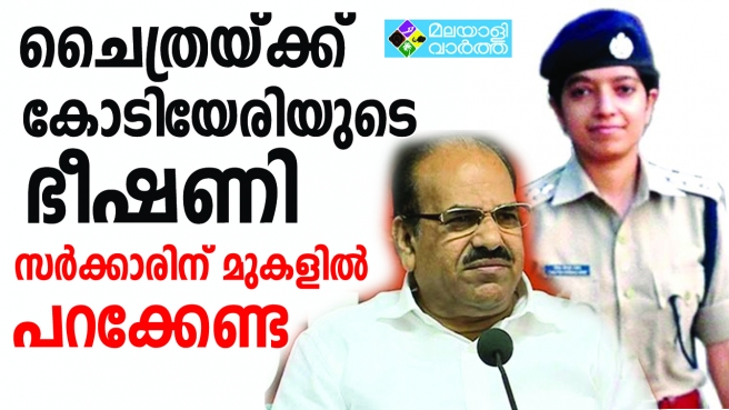 ഒരു ഉദ്യോഗസ്ഥയും സര്ക്കാരിന് മുകളില് പാറിപ്പറക്കേണ്ടെന്ന് എസ്.പി ചൈത്രാ തെരേസാ ജോണിന് സി.പി.എം സംസ്്ഥാന സെക്രട്ടറി കോടിയേരി ബാലകൃഷ്ണന്റെ ഭീഷണി. ഡി.സി.പിയായിരിക്കെ തിരുവനന്തപുരം ജി്ല്ലാകമ്മിറ്റി ഓഫീസില് നടത്തിയ റെയ്ഡ് വിലകുറഞ്ഞ പബഌസിറ്റി സ്റ്റണ്ടാണെന്നും കോടിയേരി പരിഹസിച്ചു. എല്ലാ ഓഫീസര്മാരും സര്ക്കാരിന് വിധേയമാണെന്നും കോടിയേരി പറഞ്ഞു. സി.പി.എം നിയമവിധേയമായി പ്രവര്ത്തിക്കുന്ന പാര്ട്ടിയാണ്. നിരോധിച്ച പാര്ട്ടിയല്ല. നിരോധിച്ച പാര്ട്ടികളോട് സ്വീകരിക്കുന്ന സമീപനം സി.പി.എമ്മിനോട് പാടില്ല. അത് ശരിയല്ല. വെറുതെ പാര്ട്ടി ഓഫീസില് കയറി പരിശോധന നടത്തുന്നത് സര്ക്കാര് നയമല്ലെന്നും കോടിയേരി പറഞ്ഞു.