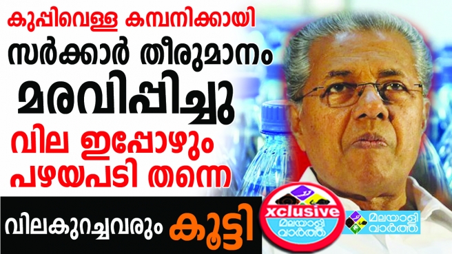 സംസ്ഥാനത്തു കുപ്പിവെള്ളത്തിന്റെ വില ലിറ്ററിന് 13 രൂപയാക്കാനുള്ള തീരുമാനം കുപ്പിവെള്ളക്കമ്പനികള്ക്കായി സര്ക്കാര് തന്നെ അട്ടിമറിച്ചു. കുപ്പിവെള്ളത്തെ അവശ്യ സാധനവില നിയന്ത്രണ നിയമത്തിന്റെ കീഴില് കൊണ്ടുവരുന്നതിനായി വിജ്ഞാപനം ഇറക്കാന് ഭക്ഷ്യമന്ത്രി പി. തിലോത്തമന് വിളിച്ചു ചേര്ത്ത യോഗം കഴിഞ്ഞിട്ട് വര്ഷം ഒന്നു കഴിഞ്ഞിട്ടും തീരുമാനം നടപ്പാക്കാന് സര്ക്കാരിനായില്ല. കുപ്പിവെള്ള നിര്മ്മാതാക്കളുടെ സംഘടനാ പ്രതിനിനിധികള് പങ്കെടുത്തു യോഗത്തിലാണ് തീരുമാനമെങ്കിലും ചുരക്കം ചില കമ്പനികള് മാത്രമാണ് വെള്ളവില കുറച്ചത്. മറ്റുള്ളവര് ഇപ്പോഴും പഴതവില തന്നെ വാങ്ങുന്നതിനാല് വിലകുറച്ചവര് വീണ്ടും വില കൂട്ടി തുടങ്ങി. സര്ക്കാര് തീരുമാനം അംഗീകരിച്ച തങ്ങള്ക്ക് വന്നഷ്ടമാണ് ഇതുമൂലമുണ്ടായതെന്നാരോപിച്ച് കോടതിയെ സമീപിക്കാനുള്ള നീക്കത്തിലാണ് ഇവര്.