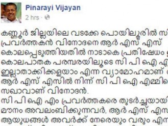 കൊലപാതക പരമ്പരയിലൂടെ സിപിഎമ്മിനെ ഇല്ലാതാക്കാം എന്ന വ്യാമോഹം ആര്എസിഎസിന് വേണ്ടെന്ന് പിണറായി, ഫെയ്സ്ബുക്ക് പോസ്റ്റിലൂടെയാണ് പിണറായി ഇക്കാര്യം അറിയിച്ചത്