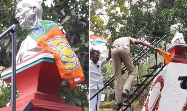 തദ്ദേശ തിരഞ്ഞെടുപ്പിന്റെ വിജയ ആഘോഷങ്ങളുടെ ഭാഗമായി ശിവജിയുടെ പതാക ഉയര്ത്തി വിവാദത്തിലായ പാലക്കാട് നഗരസഭ വീണ്ടും വിവാദത്തില്. ഇത്തവണ മഹാത്മാ ഗാന്ധിയുടെ പ്രതിമയോയാണ് ബി.ജെ.പിക്കാര് അവരുടെ കാടത്വം കാട്ടിയത്. ഗാന്ധി പ്രതിമയില് ബിജെപി കൊടി കെട്ടിയതാണ് വിവാദങ്ങള്ക്ക് കാരണം. ബിജെപിക്കെതിരെ പ്രതിഷേധവുമായി യൂത്ത് കോണ്ഗ്രസ്, ഡിവൈഎഫ്ഐ പ്രവര്ത്തകരെത്തി. കൊടി പൊലീസെത്തി അഴിച്ചുമാറ്റി.