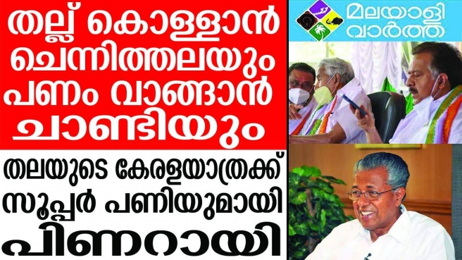 തല്ലുകൊള്ളാന് ചെണ്ട പണം വാങ്ങാന് മാരാര് എന്ന ചൊല്ല് മാറുകയാണ്. ഈ കാലത്ത് തല്ല് കൊള്ളാന് ചെന്നിത്തലയും പണം വാരാന് ഉമ്മന് ചാണ്ടിയും എന്ന പോലെയാണ് കാര്യങ്ങള്. 5 വര്ഷം ഉച്ചയ്ക്ക് പത്രസമ്മേളനം നടത്തി അടിയേറ്റു വാങ്ങിയിട്ടും അവസാനം ഉറങ്ങിക്കിടന്ന ഉമ്മന് ചാണ്ടി മുഖ്യമന്ത്രി കുപ്പായം കൊണ്ടുപോയില്ലേ. എങ്കിലും നേരത്തേ തീരുമാനിച്ച കേരള യാത്ര ചെന്നിത്തല ചടങ്ങിന് തലസ്ഥാനത്തെത്തിക്കും.