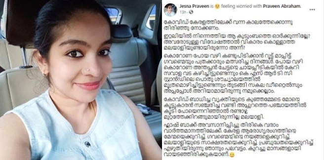 മലയാളിയുടെ കോവിഡ് പേടിയൊക്കെ എപ്പോഴേ പോയിരിക്കുന്നു. എന്നാൽ ഇപ്പോള് കോവിഡ് വന്നാലെന്ത് വന്നില്ലെങ്കില് എന്ത് എന്ന മനോഭാവത്തിലാണ് പലരുടേയും പ്രവര്ത്തികള് കാണുമ്പോൾ തോന്നാറുള്ളത്. ഇതിനിടയിലും കോവിഡിനെ ഭയപ്പാടോടെ കാണുന്ന ഒരു വിഭാഗമുണ്ടെന്ന് ഓര്മ്മിപ്പിക്കുകയാണ് ജസ്ന പ്രവീണ് യുവതി. കോവിഡ് ഒരു ജലദോഷപ്പനി മാത്രമാണെന്ന മലയാളികളുടെ തോന്നലിനെ വിമർശിക്കുകയാണ്.