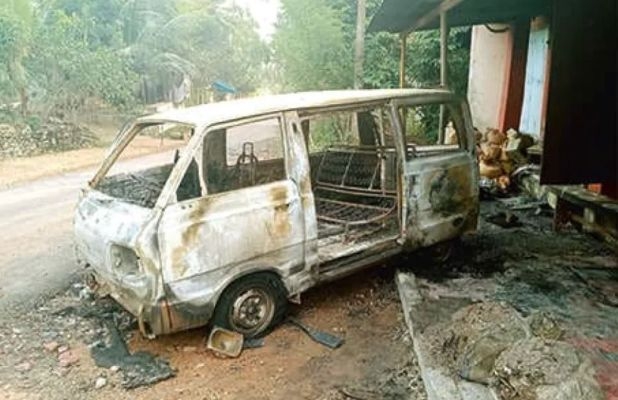 ഓടിക്കൊണ്ടിരുന്ന കാറിന് തീപിടിച്ചു; അതിഥിത്തൊഴിലാളികളായ നാലുപേര് പൊള്ളലേറ്റ് ചികിത്സയിൽ, കാര് സമീപത്തെ കടയില് ഇടിച്ചുനിന്നെങ്കിലും പൂര്ണമായും കത്തിക്കരിഞ്ഞു