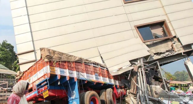 റോഡിനു താഴെയായി ബേസ്മെന്റും പിന്നെ മൂന്നു നിലകളുമുള്ള കെട്ടിടമാണ് വാഹനാപകടത്തില് പാടെ തകര്ന്നത്. മൂന്നു തൂണുകള് ഇടിയുടെ ആഘാതത്തില് തകര്ന്നതോടെ ആറു മണി കഴിഞ്ഞതോടെ ഒരു വശത്തേക്ക് ചെരിയാന് തുടങ്ങി. ഏഴു മണിയോടെ നാലു തൂണുകള്കൂടി തകര്ന്ന് കെട്ടിടം ഒരു വശത്തേക്ക് ചെരിഞ്ഞു.