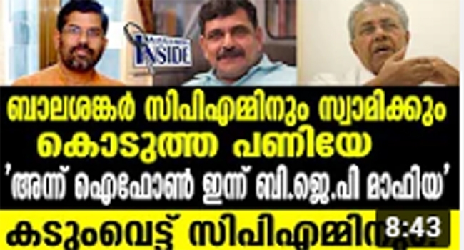 ആദ്യം ഐഫോണ് വിവാദത്തില് ചെന്നിത്തലയ്ക്കിട്ട് കൊട്ടുമായിറങ്ങിയ സ്വാമിയെ പിന്നീട് സൈബര് പോരാളികള് കൊട്ടുന്നതാണ് കണ്ടത്. വിനോദിനി ബാലകൃഷ്ണനുമായി ബന്ധപെട്ട ഐ ഫോണ് വിവാദത്തില് സാങ്കേതിക വിദ്യയും നിലപാടുമാണ് താരമായതെങ്കില് ഇന്ന് ബി.ജെ.പി മാഫിയയാണ് പ്രശ്നമായിരിക്കുന്നത്