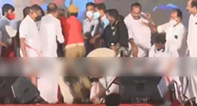 എല്.ഡി.എഫ് തെരഞ്ഞെടുപ്പ് പ്രചരണ വേദിയില് നാടകീയ രംഗങ്ങൾ; സി.പി.എം സംസ്ഥാന സെക്രട്ടറിയേറ്റ് അംഗം ബേബി ജോണിനെ പ്രസംഗിക്കുന്നതിനിടെ തള്ളിയിട്ടു; അക്രമിയെ റെഡ് വളന്റിയര്മാര് ചേര്ന്ന് വേദിയില്നിന്ന് പിടിച്ചുമാറ്റി
