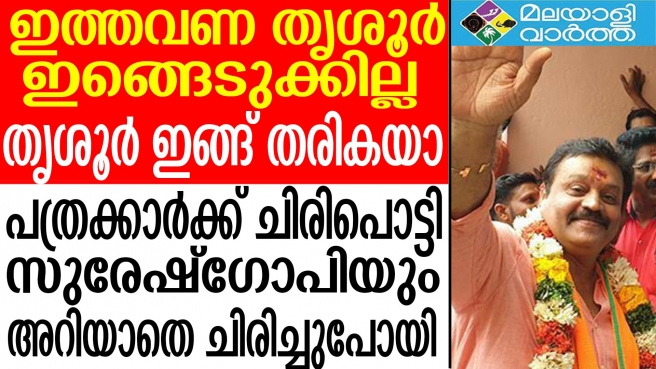 ഇത്തവണ തൃശൂര് ഇങ്ങെടുക്കില്ലെന്നാണ് സുരേഷ് ഗോപി പറയുന്നത്. അത്ഭുതത്തോടെ കേട്ടുനിന്ന പത്രക്കാരെ ചിരി പടര്ത്തി സുരേഷ് ഗോപി. ഞാന് എടുക്കേണ്ട അവര് തരികയല്ലേ. അവര് തൃശൂര് ഇങ്ങ് തരികയാ. ഇതോടെ ബലം പിടിക്കുന്ന പത്രക്കാര് ചിരിച്ചു പോയി. ഇതോടെ സുരേഷ് ഗോപിയും ചിരിച്ചു.