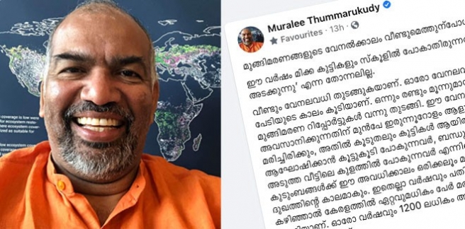 'നൂറിലധികം കുടുംബങ്ങൾക്ക് ഈ അവധിക്കാലം ഒരിക്കലൂം മറക്കാനാവാത്ത ദുഖത്തിന്റെ കാലമാകും. ഇതെല്ലാ വർഷവും പതിവാണ്. റോഡപകടങ്ങൾ കഴിഞ്ഞാൽ കേരളത്തിൽ ഏറ്റവുമധികം പേർ മരിക്കുന്നത് വെള്ളത്തിൽ മുങ്ങിയാണ്...' മുന്നറിയിപ്പുമായി മുരളി തുമ്മാരുകുടി