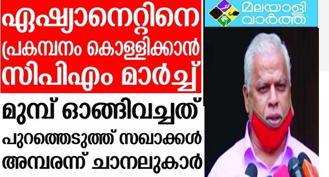 അത്രയ്ക്കായാല് പറ്റില്ല... ചാനല്ചര്ച്ച ബഹിഷ്ക്കരിച്ച് ഏഷ്യാനെറ്റിന്റെ റേറ്റിംഗ് ഇടിച്ച സംഭവത്തിന് പിന്നാലെ നേരിട്ട് ഏറ്റുമുട്ടാനൊരുങ്ങി സിപിഎം; ഇടതുപക്ഷത്തിനെതിരെ വ്യാജവാര്ത്തകള് സൃഷ്ടിക്കുന്നു എന്നാരോപിച്ച് ഏഷ്യാനെറ്റ് ഓഫീസിലേക്ക് മാര്ച്ച് നടത്തുന്നു