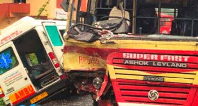 തിരുവനന്തപുരത്ത് നിന്നും ആലുവയിലേക്ക് വന്ന സൂപ്പര്ഫാസ്റ്റ് ബസ് എതിരെ വന്ന ആംബുലന്സില് ഇടിക്കുകയായിരുന്നു. ഡ്രൈവര് കാബിനില് കുടുങ്ങിയ ബെനിസണെ ഫയര്ഫോഴ്സ് സംഘവും നാട്ടുകാരും ചേര്ന്ന് ആംബുലന്സിന്റെ മുന് ഭാഗം വെട്ടിപ്പൊളിച്ചാണ് പുറത്തെടുത്തത്.