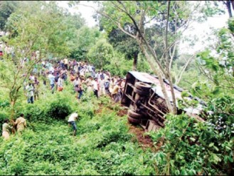കെ.എസ്.ആര്.ടി.സി. ബസ് മറിഞ്ഞ് ഒരാള് മരിച്ചു; 39 പേര്ക്ക് പരിക്കേറ്റു. ഗുരുതരമായി പരിക്കേറ്റ 19 പേരെ കോട്ടയം മെഡിക്കല് കോളേജ് ആസ്പത്രിയില് പ്രവേശിപ്പിച്ചു. പീരുമേട് കല്ലാര് പുതുമന് ആലി കൗണ്ടറുടെ മകന് മുരുകേശന്(34) ആണ് മരിച്ചത്. ദേശീയപാത 183ല് പട്ടുമുടിക്കു സമീപമാണ് ബുധനാഴ്ച ഒരുമണിയോടെ അപകടമുണ്ടായത്.