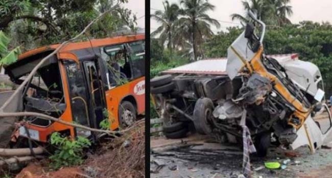 ലോറിയുടെ മുന്ഭാഗം അപകടത്തില് പൂര്ണമായും തകര്ന്നു. സമീപത്തെ താഴ്ചയിലേക്ക് നിയന്ത്രണം വിട്ട ബസ് മറിഞ്ഞെങ്കിലും സമീപത്തെ വീടിന്റെ മതിലില് ഇടിച്ചു നിന്നു.