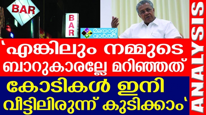 കോവിഡ് വ്യാപനത്തിന്റെ പശ്ചാത്തലത്തില് ബാറുകള് അടച്ചു പൂട്ടാന് തീരുമാനിച്ചപ്പോഴാണ് ബാര് ഉടമകളുടെ വിഷമം മാറ്റാന് കേരള സര്ക്കാര് തീരുമാനിച്ചത്. മദ്യത്തിന്റെ കാര്യമാകുമ്പോള് കോടികള് എത്ര മറിഞ്ഞെന്ന് ചോദിക്കേണ്ടതില്ലല്ലോ.