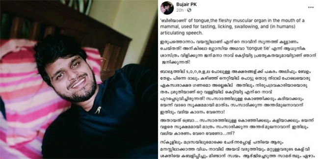 'നാവ് മുറിച്ചിട്ട് വച്ച ബിരിയാണിയാണ് ഞാന് കഴിച്ച ഏറ്റവും സ്വാദുള്ള ബിരിയാണി!..ജന്മനാ നാവ് കെട്ടിയിട്ട പ്രത്യേകതയുമായി ജനിച്ച ബുജൈർ...' വൈറലായി കുറിപ്പ്