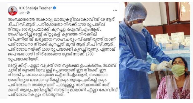 അംഗീകരിച്ച ടെസ്റ്റ് കിറ്റുകള് കുറഞ്ഞ നിരക്കില് വിപണിയില് ലഭ്യമായ സാഹചര്യം വിലയിരുത്തിയാണ് പരിശോധനാ നിരക്ക് കുറച്ചതെന്നാണ് ആരോഗ്യമന്ത്രി വ്യാഴാഴ്ച വിശദമാക്കിയത്. എന്നാല് ഇത് മുഖവിലയ്ക്കെടുക്കാതെയാണ് സ്വകാര്യ ലാബുകള് പകല്കൊള്ള തുടരുന്നത്. ആരോഗ്യമന്ത്രി ഫേസ്ബുക്ക് പോസ്റ്റിലൂടെയാണ് ഇത്തരത്തിൽ നിർദ്ദേശം നൽകിയത്.