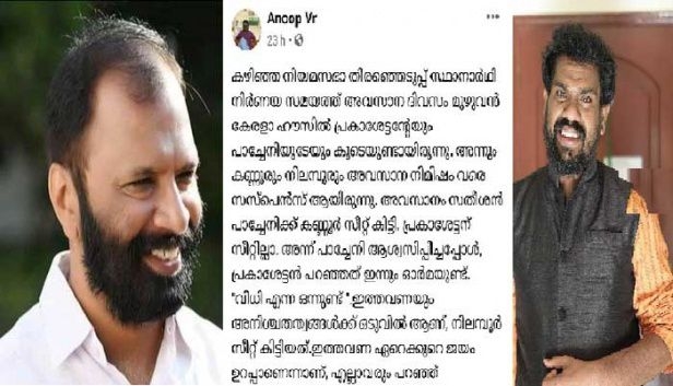 കഴിഞ്ഞതവണ സീറ്റ് ചര്ച്ചകളുടെ അവസാനനിമിഷം വരെ സസ്പെന്സ് നിലനിര്ത്തിയ മണ്ഡലങ്ങളായിരുന്നു കണ്ണൂരും നിലമ്ബൂരും. അവസാനം സതീശന് പാച്ചേനിക്ക് കണ്ണൂര് സീറ്റ് കിട്ടിയെങ്കിലും വിവി പ്രകാശിന് സീറ്റില്ല. നിലമ്ബൂര് സീറ്റ് ആര്യാടന് ഷൗക്കത്തിനാണ് ലഭിച്ചത്. അന്ന് പാച്ചേനി ആശ്വസിപ്പിച്ചപ്പോള്, വിവി പ്രകാശ് പറഞ്ഞത് 'വിധി എന്ന ഒന്നുണ്ട്' എന്നാണെന്ന് അനൂപ് ഓര്ക്കുന്നു. ഇത്തവണയും ഏറെ അനിശ്ചതത്വങ്ങള്ക്ക് ഒടുവില് ആണ് നിലമ്ബൂര് സീറ്റ് വിവി പ്രകാശിന് കിട്ടിയത്. ' ഇത്തവണ ഏറെക്കുറെ ജയം ഉറപ്പാണെന്നാണ് കേട്ടത്. പക്ഷേ.. വിധി എന്ന ഒന്നുണ്ട്.' അനൂപ് ഫെയ്സ് ബുക്കില് കുറിച്ചു.