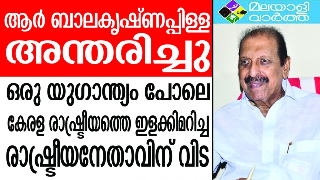 മകന്റെ ജയമറിഞ്ഞ ശേഷം... കേരളാ കോണ്ഗ്രസ് ബി ചെയര്മാന് ആര് ബാലകൃഷ്ണപ്പിള്ള അന്തരിച്ചു; അനാരോഗ്യം കാരണം ഏറെ നാളായി വിശ്രമത്തിലും ചികിത്സയിലും ആയിരുന്നു ആര് ബാലകൃഷ്ണപ്പിള്ള; കേരള രാഷ്ട്രീയത്തെ ഇളക്കി മറിച്ച ബാലകൃഷ്ണ പിള്ള വിടപറയുമ്പോള് അവസാനിക്കുന്നത് ഒരു യുഗാന്ത്യം