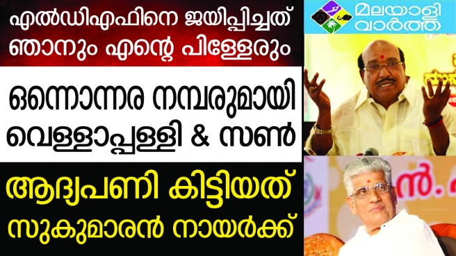 വേദനയോടെ മകളുടെ കടുംകൈ.... ഏത് മുന്നണി ജയിച്ചാലും വിജയിപ്പിച്ചയാളായി ആദ്യമെത്തുന്ന വെള്ളാപ്പള്ളി ഇത്തവണയും പതിവ് തെറ്റിച്ചില്ല; എല്ഡിഎഫ് ജയം അടിസ്ഥാന വര്ഗ വോട്ട് കൊണ്ടെന്ന് വെള്ളാപ്പള്ളി; ഒപ്പം സുകുമാരന് നായര്ക്കിട്ട് വലിയ പാരയും വച്ചു; ഫലമോ മകള് വേദനയോടെ സിന്ഡിക്കേറ്റ് സ്ഥാനം വലിച്ചെറിഞ്ഞു